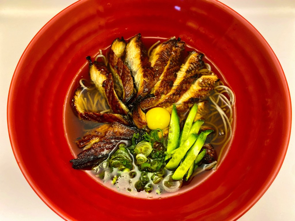 Grilled Eel and raw quail egg on top of cold buckwheat noodles.