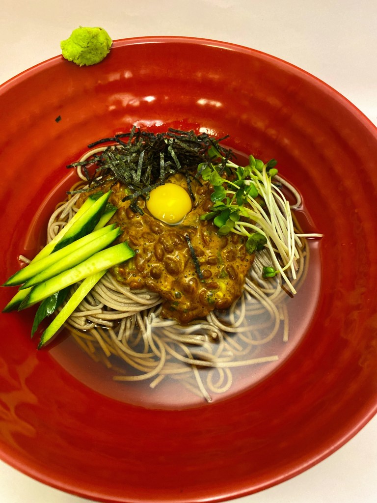 Organic non GMO Natto (fermented soybeans) and raw quail egg on top cold buckwheat noodles