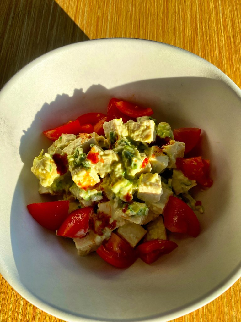 Diced tofu, tomato and avocado served with house made mayo sauce and cili oil on top.