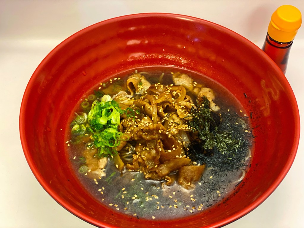 Tokyo style stir fried pork with sesame on top cold buckwheat noodles